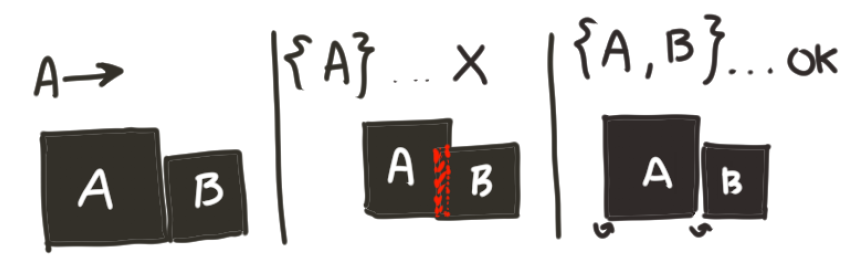 A와 B가 붙어 있을 때, { A } 만 밀면 A와 B가 겹쳐서 유효하지 않은 상태가 된다.